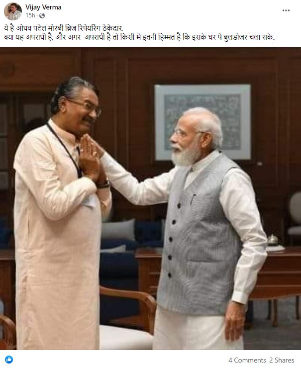 गुजरात के मोरबी में हुए पुल हादसे के बाद सोशल मीडिया पर पीएम मोदी के साथ खड़े एक शख्स की तस्वीर वायरल है। दावा किया जा रहा है कि ये वही व्यक्ति है, जिसे मोरबी ब्रिज बनाने का ठेका दिया गया था। इस दावे के साथ यह तस्वीर ट्विटर और फेसबुक पर जमकर वायरल हो रही है।