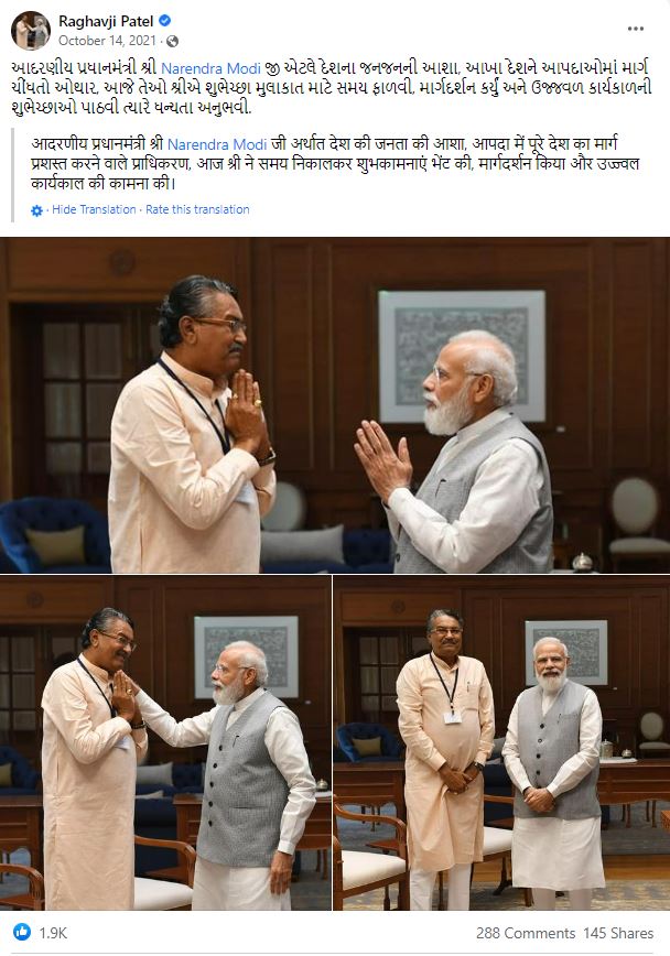 प्राप्त रिपोर्ट की मदद से हमने गुजरात के कृषि मंत्री राघवजी पटेल के आधिकारिक फेसबुक अकाउंट को खंगालना शुरू किया। हमें 14 अक्टूबर 2021 को उनके प्रोफाइल पर पीएम मोदी के साथ मुलाकात संबंधित एक पोस्ट मिला, जिसमें कई तस्वीरे हैं। इनमें वायरल तस्वीर भी मौजूद है।