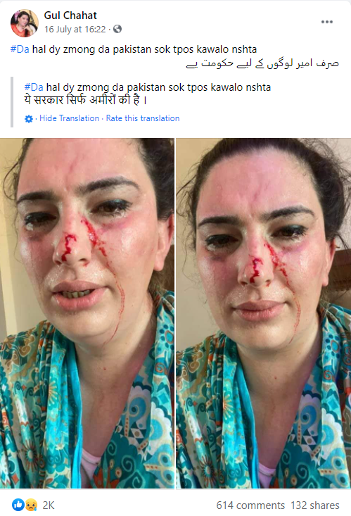 इसके बाद हमें गुल चाहत के फेसबुक पेज पर एक वीडियो भी प्राप्त हुआ, जिसमें गुल चाहत को पश्तो भाषा में बोलते देखा जा सकता है. बता दें कि गुल चाहत ने 16 जुलाई को एक लाइव वीडियो शेयर किया था, जिसमें उनके चेहरे पर चोट तथा खून देखा जा सकता है. उक्त फेसबुक वीडियो को देखने पर हमें यह जानकारी मिली कि वायरल तस्वीर में मौजूद युवती गुल चाहत ही हैं.
