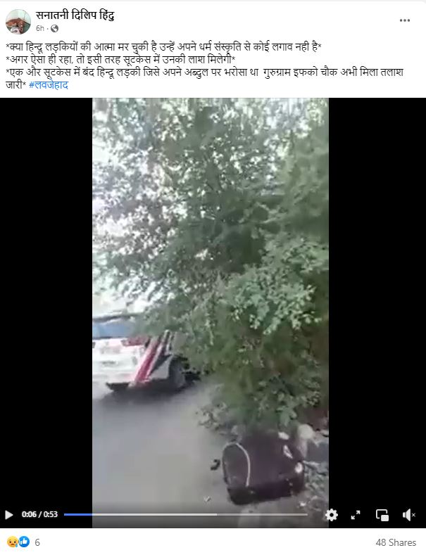 सोशल मीडिया पर सड़क किनारे दिख रहे एक सूटकेस का वीडियो वायरल है। दावा किया गया है कि इस सूटकेस में एक हिन्दू युवती की लाश है, जिसे उसके मुस्लिम पति/प्रेमी ने मारकर गुरुग्राम के इफको चौक के पास फेंक दिया है। सूटकेस के आसपास कुछ पुलिसकर्मीं भी नज़र आ रहे हैं। यह वीडियो फेसबुक और ट्विटर पर तेजी से शेयर किया जा रहा है।