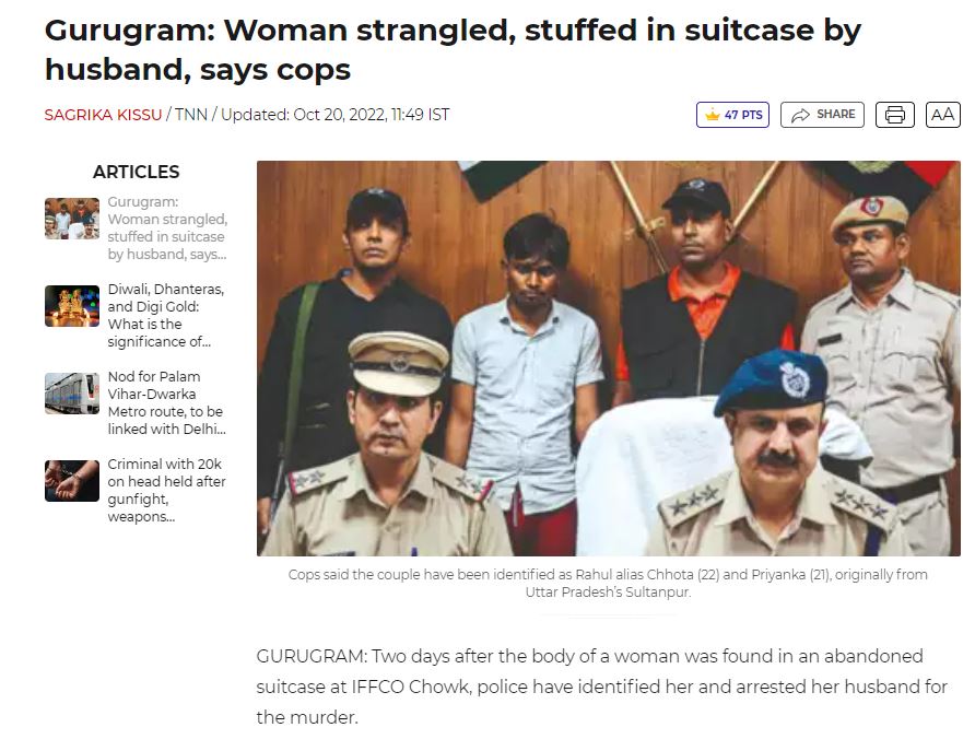 गूगल पर कुछ कीवर्ड्स को सर्च करने पर हमें NDTV द्वारा बीते 19 अक्टूबर को प्रकाशित एक रिपोर्ट मिली। रिपोर्ट के मुताबिक, गुरुग्राम के इफको चौक के पास एक सूटकेस के अंदर महिला की लाश मिली थी। इस मामले में महिला के पति को कथित तौर पर हत्या के आरोप में गिरफ्तार कर लिया गया है। रिपोर्ट में पुलिस के हवाले से लिखा गया है कि 22 साल के राहुल ने माना है कि उसने घरेलू लड़ाई-झगड़े से तंग आकर अपनी पत्नी की हत्या कर दी थी। मृत महिला का नाम प्रियंका बताया गया है जो कि गुरुग्राम के सिरहुआल गांव में अपने पति और एक साल की बेटी के साथ किराए के मकान में रहती थी।