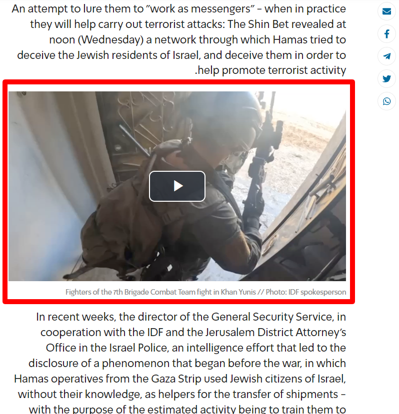 Israel Hayom (ישראל היום) द्वारा 31 जनवरी 2024 को प्रकाशित लेख के अनुसार, यह वीडियो इसराइली सेना की सातवीं ब्रिगेड कॉम्बैट टीम के जवानों द्वारा गाजा के खान यूनिस शहर में लड़ाई का है. संस्था ने लेख में IDF (Israel Defense Forces) को वीडियो का स्रोत बताया है.