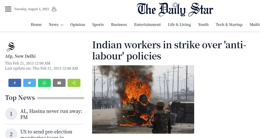 तस्वीर को हमने Tineye पर रिवर्स सर्च किया। हमें ‘The Daily Star‘ की वेबसाइट पर साल 2013 में प्रकाशित एक रिपोर्ट प्राप्त हुई। इसमें भी यह तस्वीर मिली, जिसका क्रेडिट AFP को दिया गया है। इसमें दी गई जानकारी के मुताबिक, यह नोएडा में ट्रेन यूनियन द्वारा भारत बंद बुलाए जाने के दौरान हुई हिंसा की तस्वीर है।