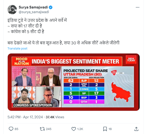इंडिया टुडे ने उत्तर प्रदेश के अपने सर्वे में सपा को 17 और कांग्रेस को 5 सीटें दी हैं। एक्स पोस्ट का आर्काइव यहां देखें।