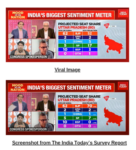 अपनी जांच से हम इस निष्कर्ष पर पहुँचते हैं कि इंडिया टुडे के चुनावी सर्वे का वायरल स्क्रीनशॉट एडिटेड है। जिसमें भाजपा, कांग्रेस और सपा को मिलने वाली संभावित सीटों की संख्या को एडिटिंग के जरिये बदला गया है।