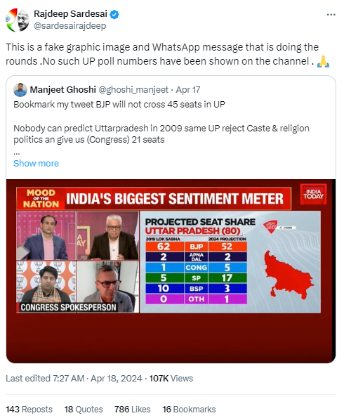 जांच में आगे हमने पाया कि इंडिया टुडे की इस लोकसभा इलेक्शन 2024 सर्वे रिपोर्ट को प्रस्तुत करने वाले पत्रकार राजदीप सरदेसाई ने 18 अप्रैल 2024 को एक्स पोस्ट के जरिये भी सपा को 17 और कांग्रेस को 5 सीटें देने वाले स्क्रीनशॉट को एडिटेड बताया है।
