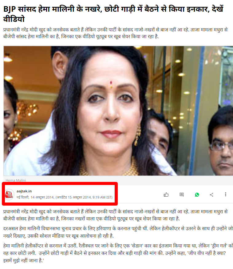 चुनाव प्रचार के लिए मथुरा पहुँची हेमा मालिनी द्वारा हेलीकॉप्टर से उतर कर छोटी गाड़ी में बैठने से इनकार कर देने के नाम पर शेयर किए जा रहे इस वीडियो की पड़ताल के लिए हमने “हेमा मालिनी ने हेलीकॉप्टर से उतर कर छोटी गाड़ी में बैठने से इनकार किया” कीवर्ड्स को गूगल पर ढूंढा. इस प्रक्रिया में हमें यह जानकारी मिली कि यह घटना साल 2014 की है.