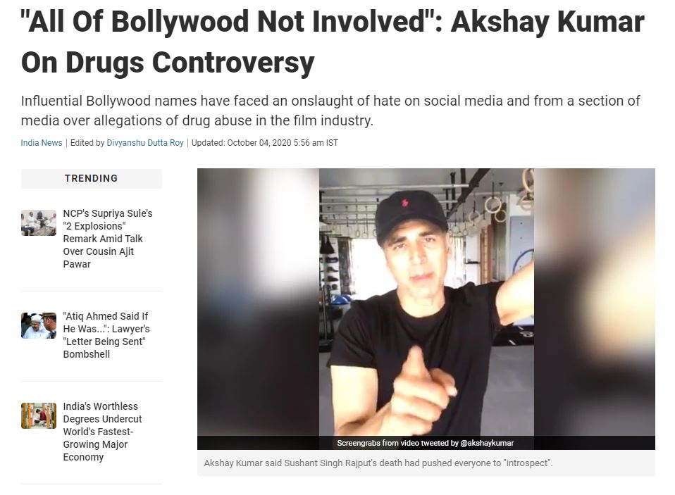 वीडियो में अक्षय कुमार कह रहे हैं कि इंडस्ट्री की ऐसी बहुत सी खामियों को देखने पर मजबूर किया है, जिनपर ध्यान जाना बहुत जरूरी है और इसी में एक मुद्दा ड्रग्स का भी है। यह एक कानूनी मुद्दा है और उन्होंने यकीन जताया कि हमारी अथॉरिटी और कोर्ट इस पर जो भी एक्शन लेगा, वो बिल्कुल सही होगा। उन्होंने लोगों से हाथ जोड़कर पूरी इंडस्ट्री को बदनाम नहीं करने की अपील भी की।