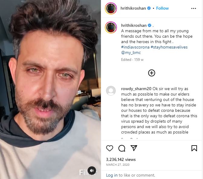 Instagram Video Uploaded by Hrithik Roshan on March 27, 2020