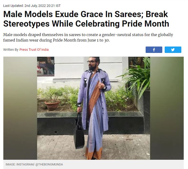 दावे की सत्यता जानने के लिए हमने वायरल तस्वीर को गूगल रिवर्स सर्च किया। हमें Republic World की वेबसाइट पर जुलाई 2022 को छपी एक रिपोर्ट मिली। बतौर रिपोर्ट, यह तस्वीर जून 2022 में एक महीने चले प्राइड मंथ में पुरुष मॉडलों की है, जिन्होंने रुढ़िवादियों को चुनौती देते हुए साड़ी पहना था। रिपोर्ट में वायरल तस्वीर मौजूद है। तस्वीर मॉडल पुष्पक सेन की बताई गई है। इस रिपोर्ट में उनका इंस्टाग्राम हैंडल भी सलंग्न है।
