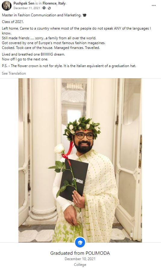 अधिक जानकारी के लिए Newschecker ने पुष्पक सेन से फेसबुक पर संपर्क किया। उन्होंने बताया, “मैंने जेएनयू में कभी कदम नहीं रखा है। मुझे यह भी नहीं पता कि वह जगह कैसी दिखती है। मैंने कोलकाता के आशुतोष कॉलेज और कलकत्ता विश्वविद्यालय से पढ़ाई की है। इसके बाद इटली के फ्लोरेंस में पोलिमोडा का एक गौरवान्वित पूर्व छात्र हूं, जो कि दुनिया के सबसे अच्छे फैशन स्कूलों में से एक है।”