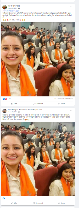 सोशल मीडिया पर ये तस्वीर साल 2021 से एक अन्य दावे के साथ वायरल हुई थी, जहां ये दावा किया गया था कि उत्तरांचल यूनिवर्सिटी के दीक्षांत समारोह में छात्र-छात्राएं काले रंग के गाउन और टोपी की जगह हल्के पीले रंग के सादे कुर्ते और गले में भगवा रंग का स्कार्फ पहनकर शामिल हुए।