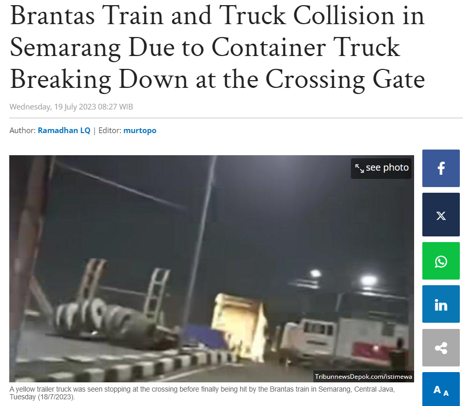 Tribunnews.com, SuaraMerdeka.com, Harian Kompas तथा detikcom द्वारा 18 तथा 19 जुलाई, 2023 को प्रकाशित लेखों के अनुसार, यह वीडियो इंडोनेशिया के सेंट्रल जावा प्रांत के West Semarang जिले का है, जहां Jalan Madukoro Raya क्रॉसिंग पर 112 Brantas ट्रेन एक ट्रक कंटेनर के साथ टकरा गई थी. लेखों में यह जानकारी भी दी गई है कि इस हादसे में एक व्यक्ति घायल हो गया था.