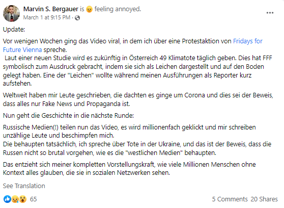 पड़ताल के दौरान हमने कुछ कीवर्ड की मदद से फेसबुक पर खोजना शुरू किया। इस दौरान हमें Marvin S. Bergauer के फेसबुक प्रोफाइल पर एक पोस्ट प्राप्त हुआ, जिसमें उन्होंने वायरल वीडियो को लेकर किए जा रहे दावे के संबंध में अपना स्पष्टीकरण दिया है। जर्मन भाषा में लिखे उनके इस फेसबुक पोस्ट के अनुसार, उन्होंने इस बात की पुष्टि की है कि ये वीडियो रिपोर्ट ऑस्ट्रिया मे जलवायु नीतियों को लेकर हुए विरोध प्रदर्शन के बारे में थी और इसका यूक्रेन-रूस विवाद से कोई संबंध नहीं है।