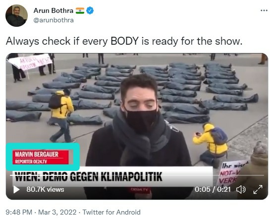 भारतीय मीडिया यूक्रेन में फर्जी मृतकों का वीडियो दिखाकर यूक्रेन संकट को बढ़ा-चढ़ाकर पेश कर रही है, दावे के साथ वायरल वीडियो की सत्यता जांचने के लिए हमने इसे inVid टूल की मदद से कुछ की-फ्रेम्स में बदला। एक की-फ्रेम के साथ गूगल सर्च किया। इस दौरान हमें आईपीएस अधिकारी अरुण बोथरा के ट्विटर हैंडल द्वारा 02 मार्च, 2022 को किया गया एक ट्वीट प्राप्त हुआ। ट्वीट के कैप्शन में लिखा है, “Always check if every BODY is ready for the show” जिसका हिंदी अनुवाद है, ‘हमेशा ये जांच लें कि क्या हर कोई शो के लिए तैयार है।’