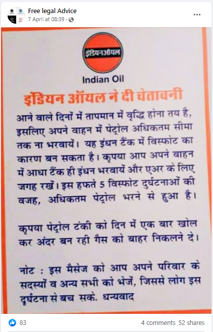 सोशल मीडिया पर इंडियन ऑयल का हवाला देते हुए एक पोस्ट शेयर कर दावा किया जा रहा है कि आने वाले दिनों में तापमान बढ़ने के आसार हैं, इसलिए अपनी गाड़ी की पट्रोल टंकी फुल ना कराएं।