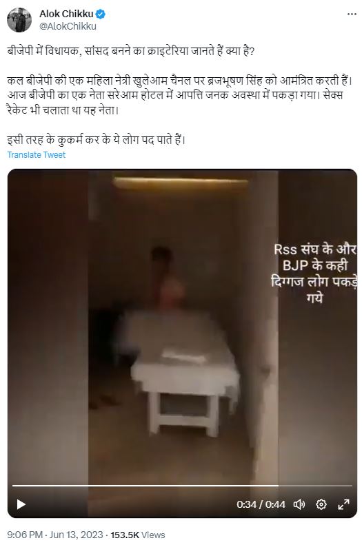 सोशल मीडिया पर एक वीडियो शेयर कर दावा किया जा रहा है कि बीजेपी के नेता सरेआम एक होटल में आपत्तिजनक अवस्था में पकड़े गए। वीडियो को बीजेपी सांसद बृजभूषण शरण सिंह के मामले से जोड़ते हुए शेयर किया गया है।