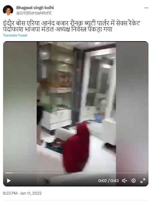 दावे की सत्यता जानने के लिए हमने गूगल पर कुछ कीवर्ड सर्च किया। हमें Bhagwat Singh Lodhi नामक ट्विटर यूजर की प्रोफाइल से 10 जनवरी 2022 को किया गया एक ट्वीट मिला। इस ट्वीट में वायरल वीडियो मौजूद है। वीडियो में दी गई जानकारी के अनुसार, इसे इंदौर के एक ब्यूटी पार्लर का बताया गया है। कैप्शन में लिखा है, “इंदौर बोस एरिया आनंद बजार रौनक ब्यूटी पार्लर में सेक्स रैकेट पर्दाफाश, भाजपा मंडल अध्यक्ष निर्वस्त्र पकड़ा गया।”