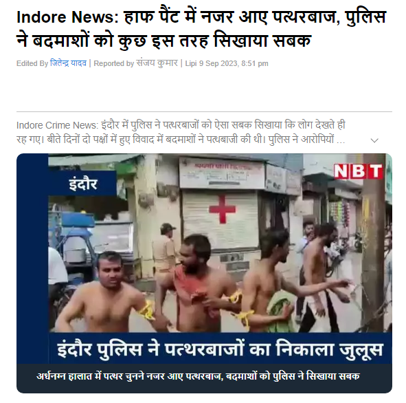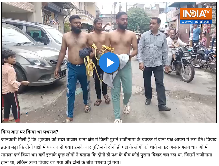 जांच में हमें इस मामले से जुड़ी रिपोर्ट इंडिया टीवी की वेबसाइट पर 9 सितंबर 2023 को प्रकाशित मिली. रिपोर्ट में दी गई जानकारी के अनुसार, 8 सितंबर 2023 को सदर बाजार थाना क्षेत्र के किसी पुराने मामले के राजीनामे के चक्कर में दोनों पक्ष आपस में लड़ बैठे और पथराव भी किया. जिसके बाद पुलिस ने दोनों पक्षों के खिलाफ मामला दर्ज किया और दोनों पक्षों के 8 लोगों को अर्धनग्न करके जुलूस निकले एवं पत्थर चुनवाए.