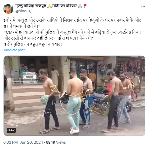 वीडियो को वायरल दावे वाले कैप्शन के साथ शेयर किया गया है, जिसमें लिखा हुआ है “इंदौर में अब्दुल और उसके साथियों ने मिलकर ईद पर हिंदूओं के घर पर पत्थर फेंके और डराने धमकाने लगे थे. CM-मोहन यादव जी की पुलिस ने अब्दुल गैंग को थाने में बढ़िया से कूटा.अर्द्धनग्न किया और रस्सी से बांधकर वहीं लेकर आईं जहां पत्थर फेंके थें. इंदौर पुलिस का बहुत बहुत धन्यवाद”.