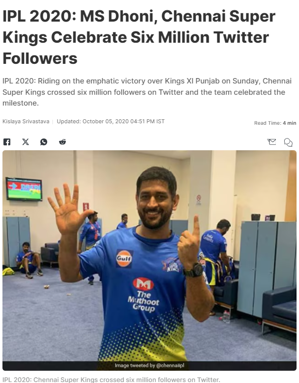 प्राप्त जानकारी के आधार पर हमने गूगल की-वर्ड सर्च किया। परिणाम में हमें 5 अक्टूबर 2020 को इस तस्वीर के साथ एनडीटीवी द्वारा प्रकाशित रिपोर्ट मिली। रिपोर्ट में बताया गया है कि ट्विटर पर चेन्नई सुपर किंग्स के छः मिलियन फॉलोअर्स होने पर टीम ने अपने सोशल मीडिया अकाउंट से टीम के खिलाड़ियों की तस्वीर शेयर की थी। रिपोर्ट में आगे बताया गया है कि खिलाड़ियों ने छः संख्या को चिह्नित करते हुए तस्वीरें पोस्ट की थी।