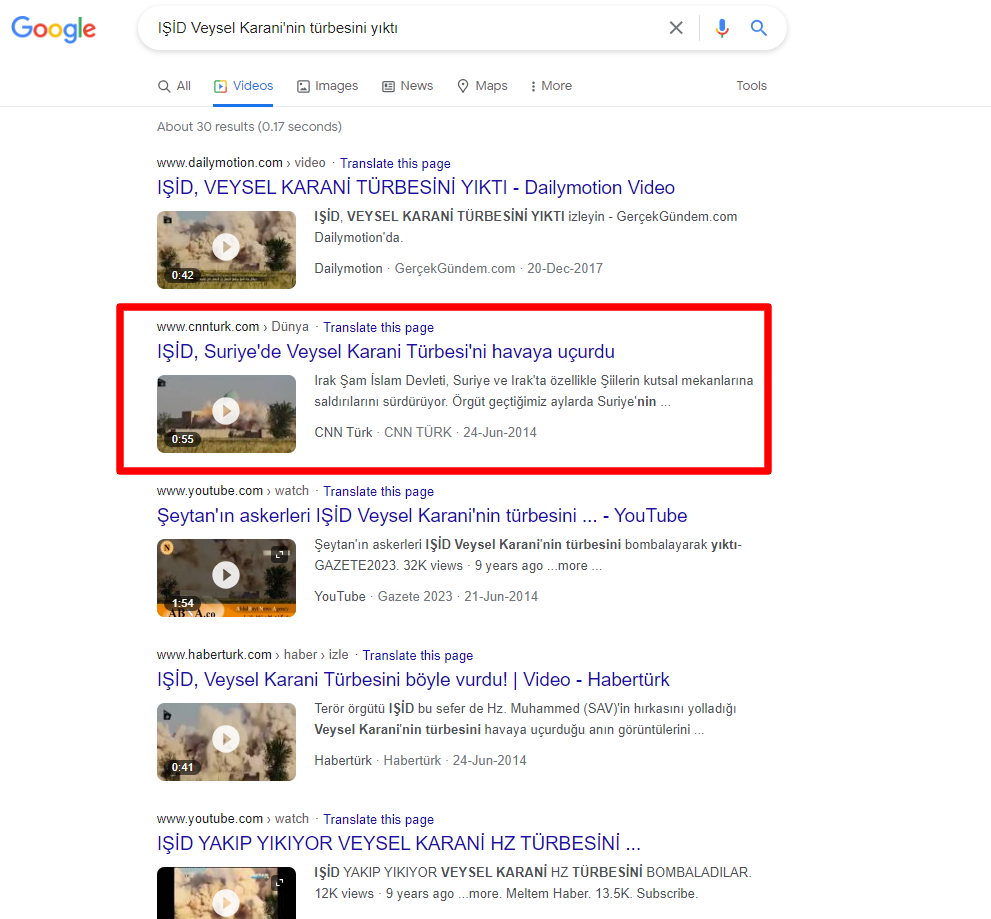 zohreanaforum.com पर प्रकाशित आर्टिकल के शीर्षक ‘IŞİD Veysel Karani’nin türbesini yıktı’ को गूगल पर ढूंढने पर हमें यह जानकारी मिली कि CNN के तुर्की संस्करण के अलावा कई स्थानीय मीडिया संस्थानों ने 2014 के जून महीने में इस वीडियो को प्रकाशित किया था.