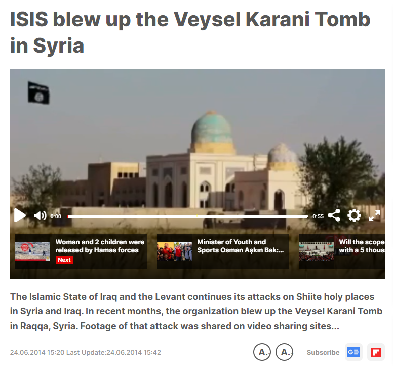 CNN TÜRK, Habertürk, Ulusal तथा RiSALE HABER द्वारा साल 2014 के जून महिने में प्रकाशित लेखों में भी यही जानकारी दी गई है कि यह वीडियो ISIS और इराक द्वारा सीरिया में Veysel Karani मस्जिद (या मकबरा) ध्वस्त करने का है.