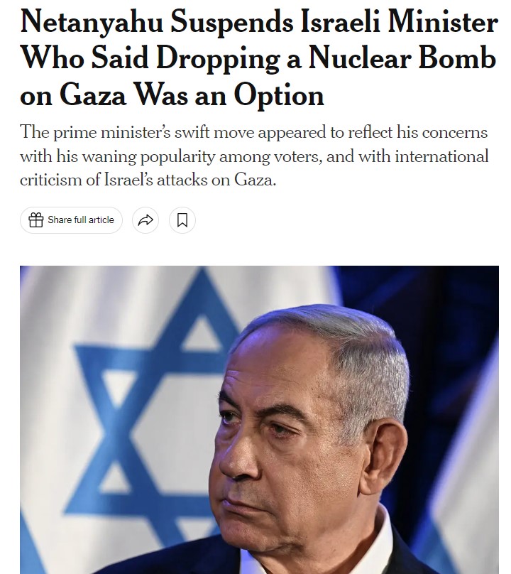 5 नवंबर 2023 को न्यूयार्क टाइम्स की वेबसाइट पर प्रकाशित रिपोर्ट के अनुसार, इसराइल सरकार के पूर्व विरासत मंत्री एमिचाई एलियाहू ने एक रेडियो स्टेशन को दिए बयान में कहा था कि हमास से निपटने के लिए गाजा पर परमाणु गिराना भी एक विकल्प है.