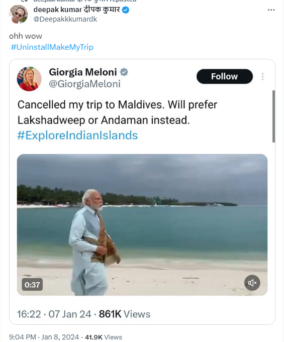 इटली की प्रधानमंत्री जियोर्जिया मेलोनी ने ट्वीट कर लक्षद्वीप घूमने की बात कही.