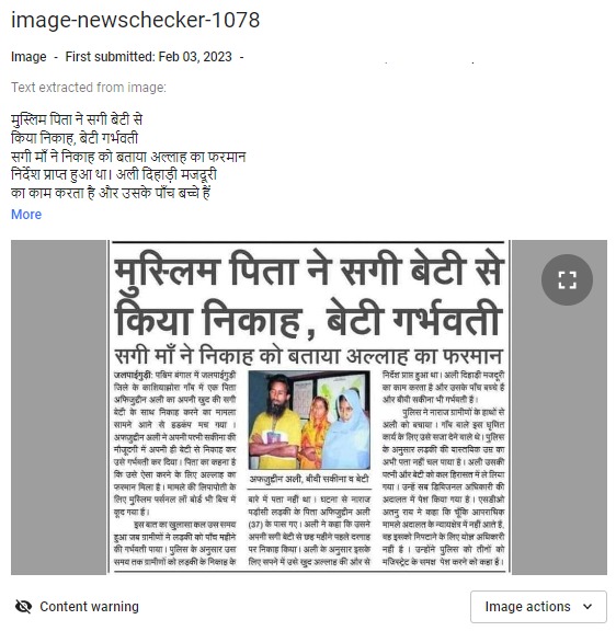सोशल मीडिया पर एक चौंकाने वाली खबर का स्क्रीनशॉट काफी वायरल हो रहा है. वायरल खबर में बताया गया है कि पश्चिम बंगाल के जलपाईगुड़ी में एक मुस्लिम पिता ने अपनी सगी बेटी से निकाह कर उसे गर्भवती कर दिया. खबर में एक फोटो मौजूद है, जिसमें एक व्यक्ति दो महिलाओं के साथ खड़ा देखा जा सकता है.