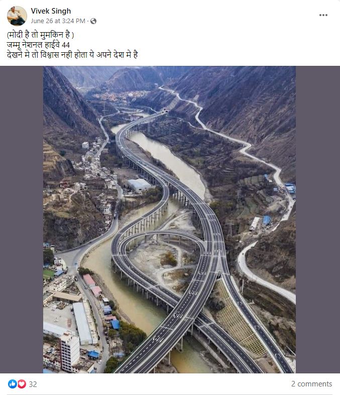 सोशल मीडिया पर हाईवे की एक तस्वीर शेयर कर दावा किया जा रहा है कि यह जम्मू कश्मीर एक्सप्रेस-वे की फोटो है। साथ ही इस हाईवे को बनावने का श्रेय पीएम नरेंद्र मोदी को दिया जा रहा है।