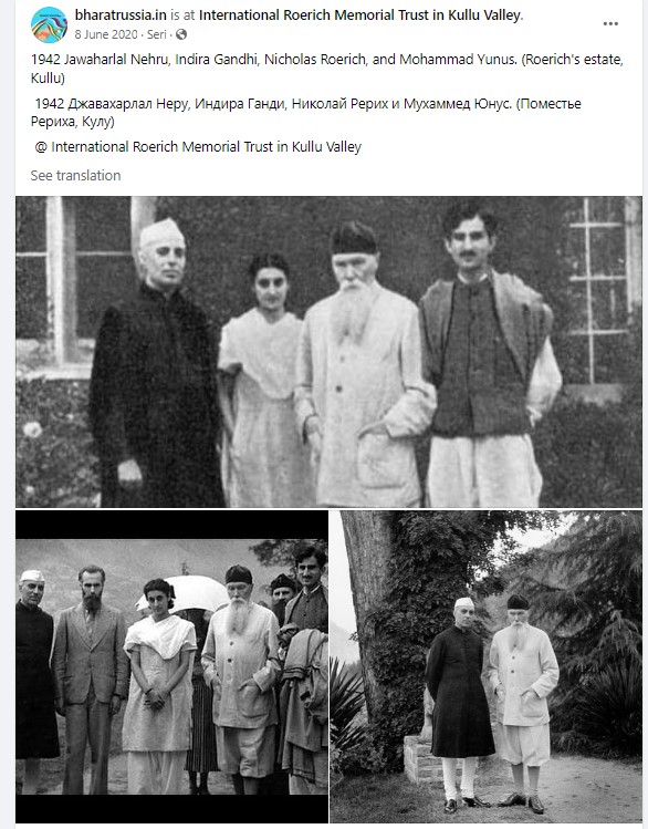 जांच में हमने संबंधित कीवर्ड की मदद से गूगल सर्च किया तो हमें bharatrussia.in नाम के फ़ेसबुक पेज से 8 जून, 2020 को शेयर किया गया एक पोस्ट प्राप्त हुआ. इस पोस्ट में वायरल तस्वीर के अलावा दो अन्य तस्वीरें भी मौजूद हैं. तस्वीर के साथ मौजूद कैप्शन में बताया गया है कि इसमें जवाहर लाल नेहरू, इंदिरा गांधी, निकोलस रोरिक और मोहम्मद यूनुस मौजूद हैं. कैप्शन में यह भी बताया गया है कि यह तस्वीर 1942 में रोरिक एस्टेट कुल्लू में खींची गई है.