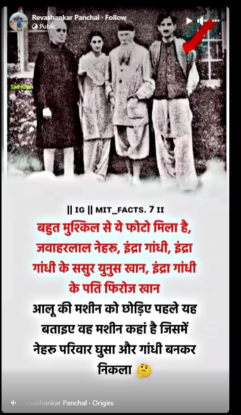 वायरल तस्वीर में टेक्स्ट भी मौजूद है, जिसमें लिखा हुआ है “बहुत मुश्किल से ये फोटो मिला है, जवाहरलाल नेहरू, इंद्रा गांधी, इंद्रा गांधी के ससुर युनुस खान, इंद्रा गांधी के पति फिरोज खान. आलू की मशीन को छोड़िए पहले यह बताइए वह मशीन कहां है जिसमें नेहरू परिवार घुसा और गांधी बनकर निकला”.