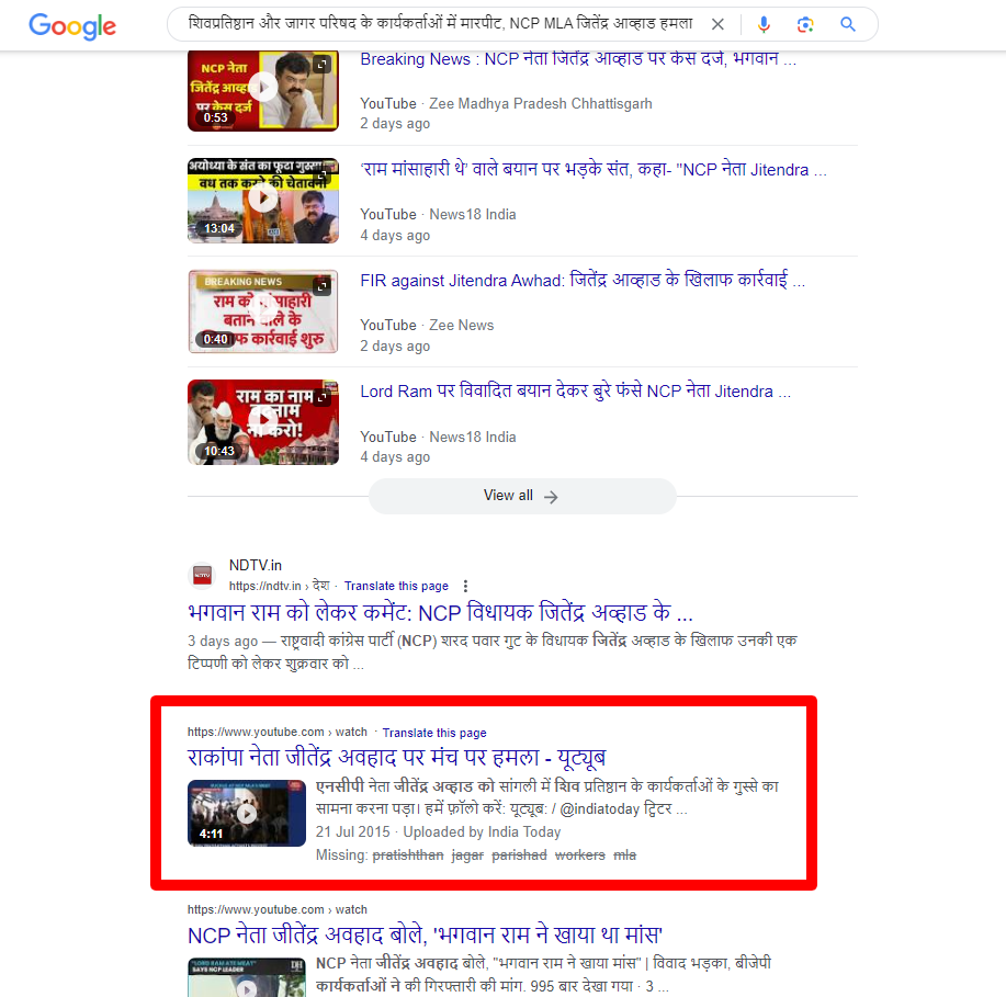 राम को लेकर विवादित टिप्पणी करने वाले NCP विधायक जितेंद्र आव्हाड की हिन्दू समाज के लोगों द्वारा पिटाई के नाम पर शेयर किए जा रहे इस दावे की पड़ताल के लिए हमने वायरल वीडियो में सुनाई दे रही आवाज के आधार पर ‘शिवप्रतिष्ठान और जागर परिषद के कार्यकर्ताओं में मारपीट, NCP MLA जितेंद्र आव्हाड हमला’ कीवर्ड्स को गूगल पर ढूंढा. इस प्रक्रिया में हमें India Today द्वारा साल 2015 में प्रकाशित एक यूट्यूब वीडियो मिला, जिसमें वायरल वीडियो के दृश्य मौजूद हैं.