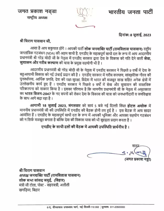 इसके बाद हमने वायरल लेटर का मिलान जेपी नड्डा की तरफ से जारी किए गए असल लेटर से किया. इस दौरान हमें नवभारत टाइम्स की वेबसाइट पर प्रकाशित एक ऐसा ही लेटर मिला, जो भाजपा अध्यक्ष ने लोजपा (रामविलास गुट) के अध्यक्ष चिराग पासवान को लिखा था.