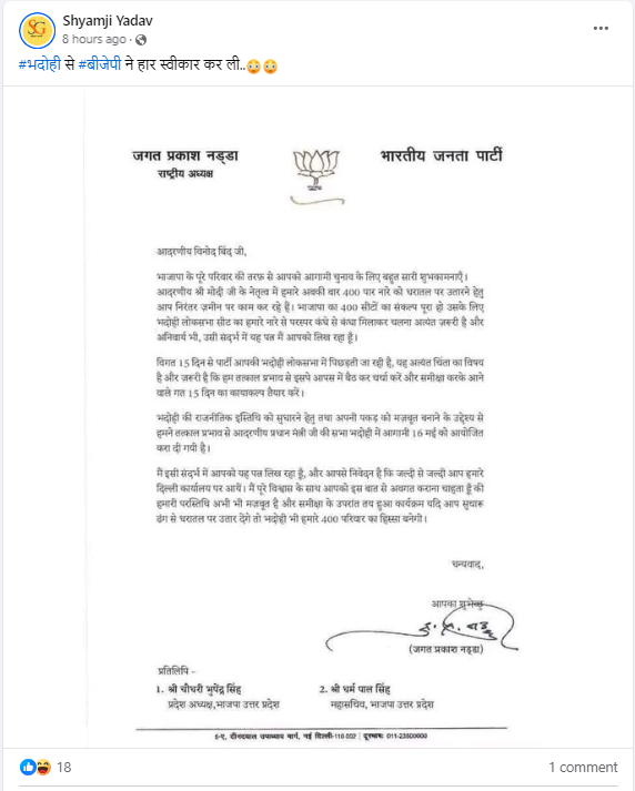 सोशल मीडिया पर भाजपा के राष्ट्रीय अध्यक्ष जे पी नड्डा की तरफ से जारी किया गया एक कथित लेटर वायरल हो रहा है, जो उन्होंने कथित तौर उत्तरप्रदेश के भदोही से लोकसभा प्रत्याशी विनोद बिंद को लिखा है. इस लेटर में यह दावा किया जा रहा है कि जेपी नड्डा ने भदोही में भाजपा के पिछड़ने को लेकर चिंता जताई है.