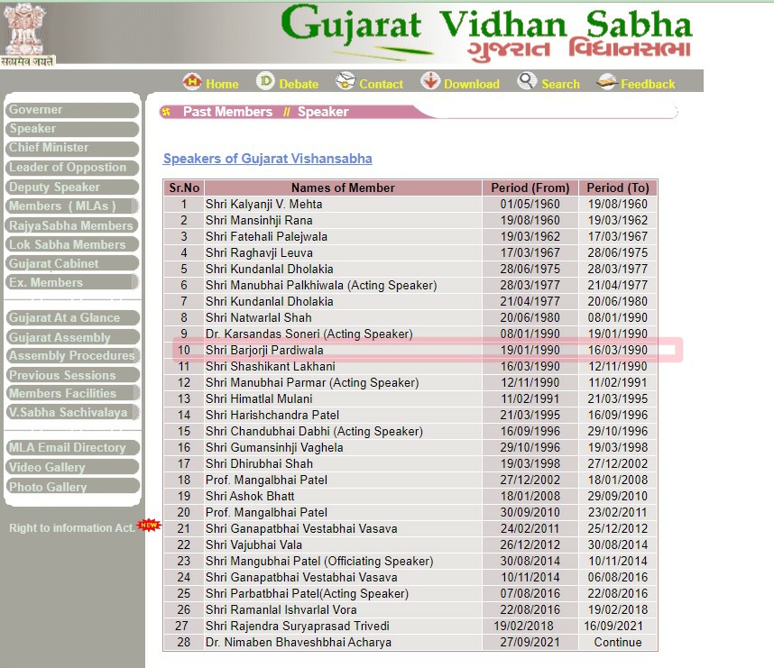 इसके बाद हमने गुजरात विधानसभा की वेबसाइट को सर्च किया। जिसके मुताबिक, बुर्जोर कावासजी पारदीवाला 19 जनवरी 1990 से लेकर 16 मार्च 1990 तक गुजरात विधानसभा के स्पीकर रहे हैं।