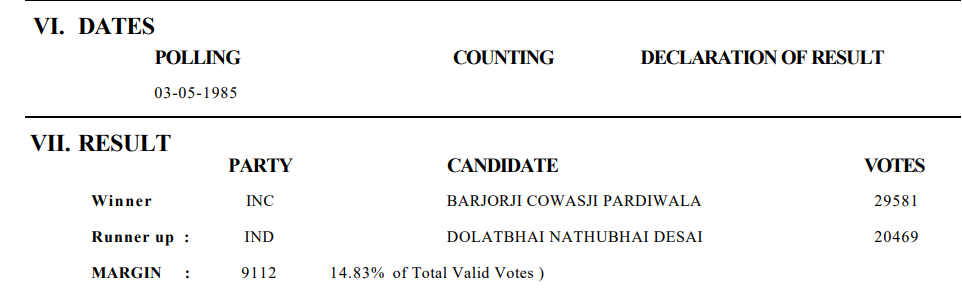 सर्च करने पर हमें चुनाव आयोग (Election Commision) की वेबसाइट पर बुर्जोरजी कावासजी के बारे में पता किया। वेबसाइट के मुताबिक, बुर्जोर कावासजी ने 1985 के गुजरात विधानसभा चुनाव में वलसाड सीट से कांग्रेस के टिकट पर चुनाव लड़ते हुए लगभग 9 हजार वोटों से जीत हासिल की थी।
