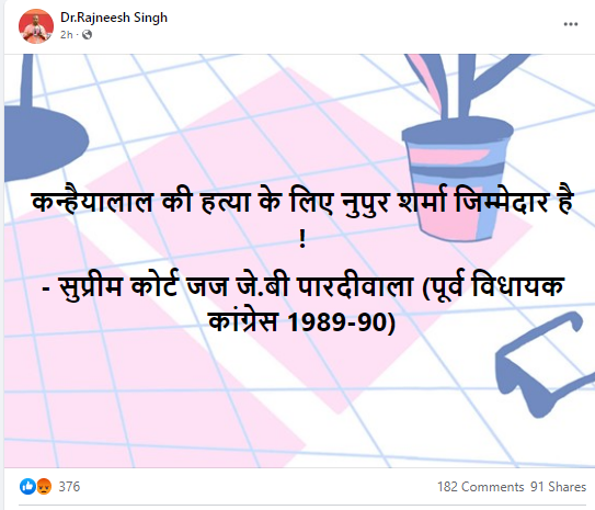 सुप्रीम कोर्ट ने आज पूर्व बीजेपी प्रवक्ता नूपुर शर्मा की एक याचिका पर सुनवाई करते हुए उन्हें फटकार लगाई है। इसके बाद से सोशल मीडिया पर सुप्रीम कोर्ट के जज को लेकर एक पोस्ट काफी वायरल है। दावा किया जा रहा है कि नूपुर शर्मा को फटकार लगाने वाले सुप्रीम कोर्ट के जज जेबी पारदीवाला 1989-90 में कांग्रेस के विधायक थे।