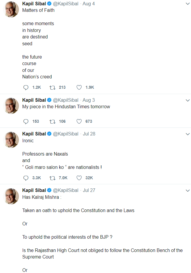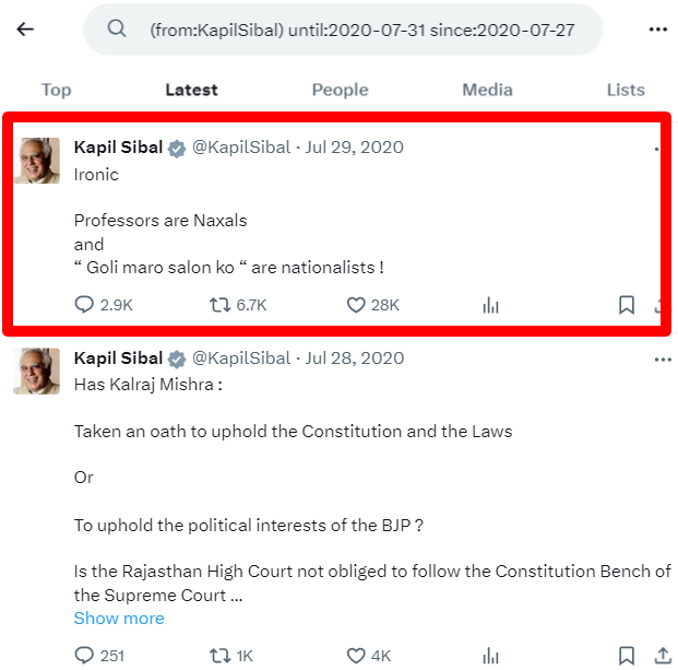 दावे के अनुसार, कपिल सिब्बल ने वायरल ट्वीट 29 जुलाई 2020 को शेयर किया था, इसीलिए इसके बारे में अधिक जानकारी के लिए हमने कपिल सिब्बल के आधिकारिक X हैंडल द्वारा 27 जुलाई 2020 और 31 जुलाई 2020 के बीच शेयर किए गए ट्वीट्स को खंगाला. इस प्रक्रिया में हमें यह जानकारी मिली कि कपिल सिब्बल ने इस बीच केवल 2 ट्वीट शेयर किए थे, जिनमें वायरल ट्वीट मौजूद नहीं है.