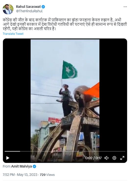 सोशल मीडिया पर एक वीडियो शेयर कर दावा किया जा रहा है कि कर्नाटक में कांग्रेस की जीत के बाद भटकल में पाकिस्तान का झंडा फहराया गया। वीडियो में एक व्यक्ति एक चौक पर झंडा लहराते हुए देखा जा सकता है।