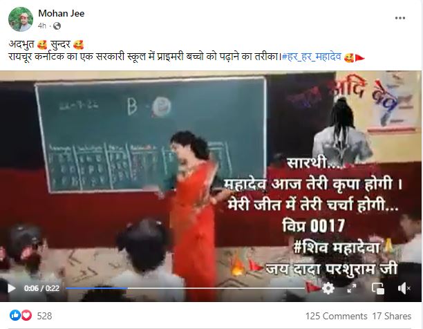 सोशल मीडिया पर एक वीडियो वायरल है जिसमें एक महिला कुछ बच्चों के साथ ‘हर हर शंभू शिव महादेव’ गाने पर डांस करते हुए नज़र आ रही है। वीडियो को शेयर करते हुए दावा किया जा रहा है कि ये कर्नाटक के रायचूर के एक सरकारी स्कूल का वीडियो है। जहां एक टीचर ने बच्चों को पढ़ाने का ये तरीका निकाला है।