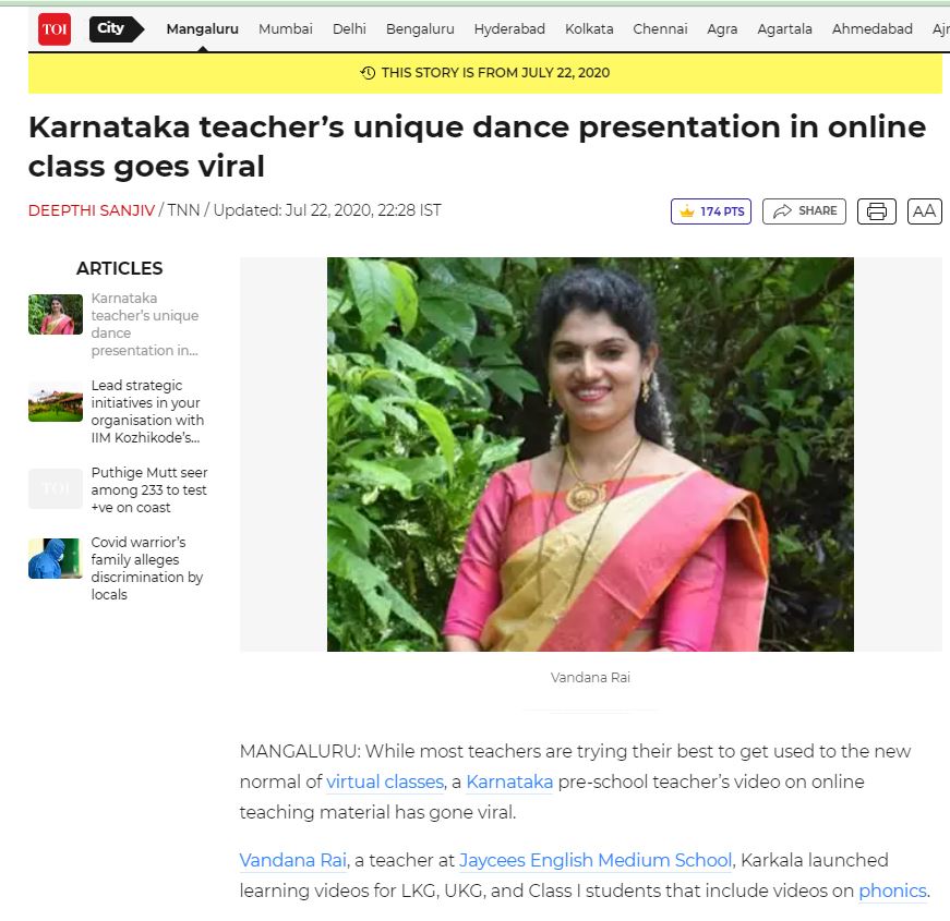 दावे की सत्यता जानने के लिए हमने वीडियो को Invid टूल की मदद से कुछ कीफ्रेम में बदला। फिर एक कीफ्रेम को गूगल लेंस से सर्च किया। हमें Scoonews नामक वेबसाइट पर 2020 में छपी एक रिपोर्ट मिली। जिसके अनुसार, कर्नाटक के मंगलुरु में एक डांस टीचर ने छात्रों को पढ़ाने के लिए एक नायाब तरीका निकाला है जिस कारण वो काफी लोकप्रिय हो गई हैं। रिपोर्ट के मुताबिक, टीचर का नाम वंदना राय है और वे मंगलुरु के जेसीस इंग्लिश मीडियम स्कूल में डांस टीचर हैं।
