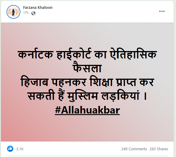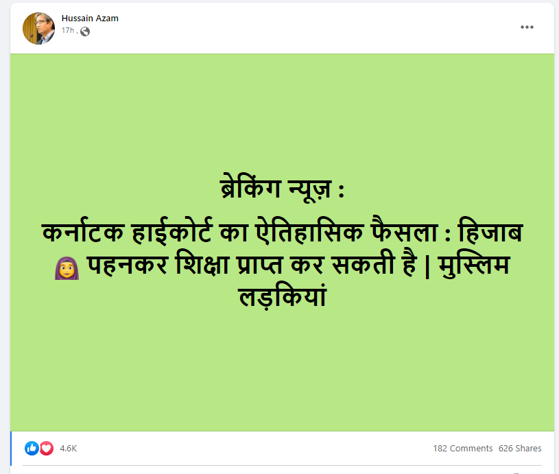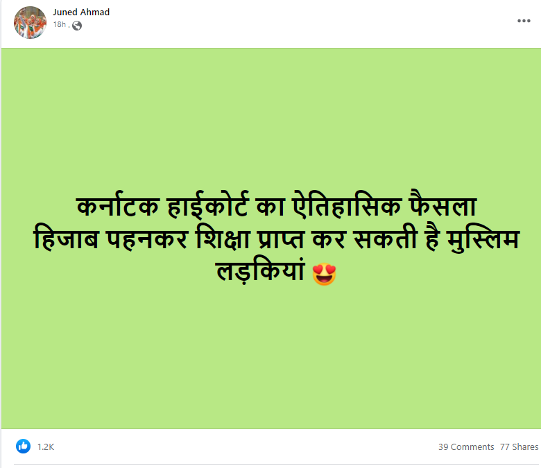 कर्नाटक में हिजाब पर मचे घमासान के बीच सोशल मीडिया पर दावा किया जा रहा है कि ‘कर्नाटक हाई कोर्ट का ऐतिहासिक फैसला, हिजाब पहनकर स्कूल जा सकती हैं मुस्लिम लड़कियां।’