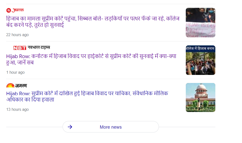 ज्यादा जानकारी के लिए हमने कुछ कीवर्ड की मदद से दोबारा गूगल पर खोजना शुरू किया। इस दौरान कुछ मीडिया संस्थानों द्वारा प्रकाशित रिपोर्ट्स प्राप्त हुईं। रिपोर्ट्स के मुताबिक, यह मामला अब सुप्रीम कोर्ट में पहुँच चुका है। हिजाब को लेकर सुप्रीम कोर्ट में दायर की गई याचिका की वकालत करते हुए कपिल सिब्बल ने इस केस को कर्नाटक हाई कोर्ट से सुप्रीम कोर्ट में ट्रांसफर करने की मांग करते हुए, दलील दी है कि यह मामला बेहद संवेदनशील है और पूरे देश में फैलता जा रहा है लिहाजा इस पर सुप्रीम कोर्ट को तत्काल सुनवाई करनी चाहिए।