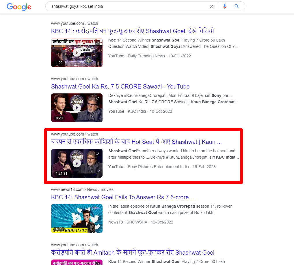 उपरोक्त जानकारी के आधार पर हमने ‘shashwat goyal kbc set india’ कीवर्ड को गूगल पर ढूंढा. इस प्रक्रिया में हमें Sony Pictures Entertainment India द्वारा 15 फरवरी, 2023 को प्रकाशित एक वीडियो प्राप्त हुआ.