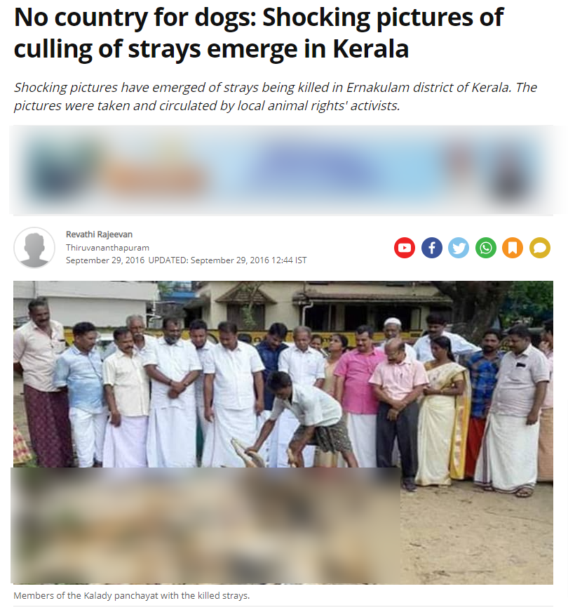 India Today द्वारा 29 सितंबर, 2016 को प्रकाशित एक लेख के अनुसार केरल के एर्नाकुलम (Ernakulam) जिले के कालडी ग्राम पंचायत (Kalady Grama Panchayat) में भारी संख्या में कुत्तों को मार दिया गया था. इस मामले में पुलिस ने पंचायत के 17 सदस्यों के खिलाफ 22 कुत्तों को मारने का मुकदमा दर्ज किया था. Hindustan Times, DailyO तथा The News Minute द्वारा साल 2016 में इसी विषय पर प्रकाशित लेखों में भी कुछ ऐसी ही जानकारी दी गई है.