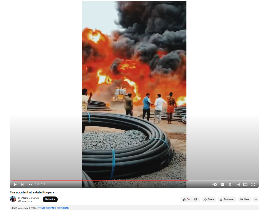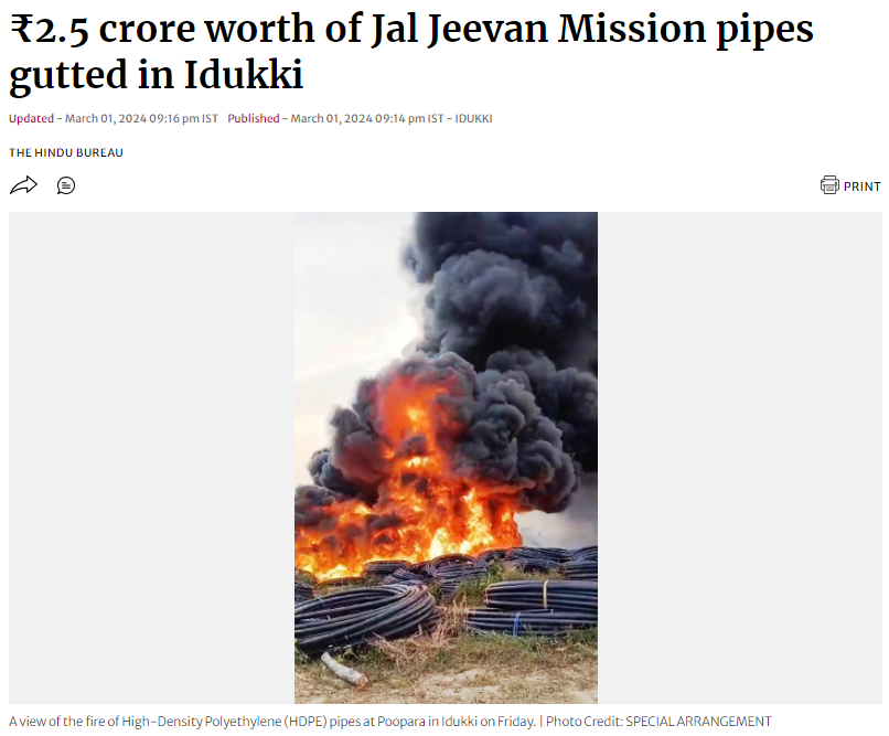 ईटीवी मलयालम की रिपोर्ट के अनुसार, 1 मार्च 2024 की शाम को इडुक्की जिले के पूपारा ग्राम कार्यालय के पास आग लग गई थी. इस दौरान वहां रखे जल जीवन मिशन के पाइप में भी आग लग गई. इस दौरान करोड़ों रुपए की पाइप को नुकसान पहुंचा था. आग लगने के बाद आस-पास के फायर बिग्रेड यूनिट ने वहां पहुंचकर आग बुझाने की कोशिश भी की, लेकिन अधिकांश पाइप तब तक जल गए थे. इस रिपोर्ट में आग लगने के कारणों का उल्लेख नहीं किया गया था.