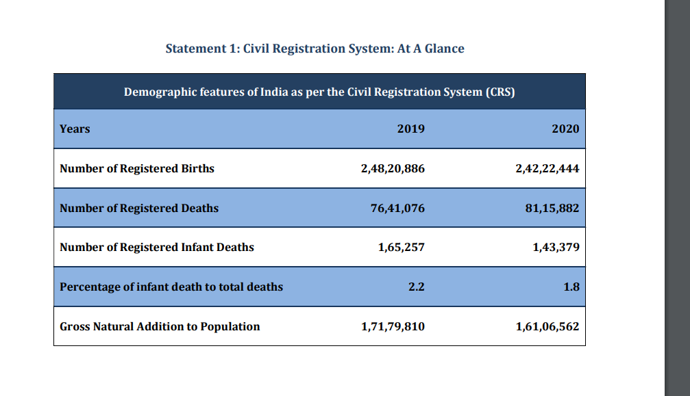 इन आंकड़ों के अनुसार, साल 2020 में करीब 2,42,22,444 बच्चों ने जन्म लिया, जिसमें से 1,25,96,700 लड़के और 1,16,24,933 लड़कियां थी. इनमें से करीब 73% का जन्म अस्पताल में जबकि बाकी 27% का जन्म अन्य जगहों पर हुआ.