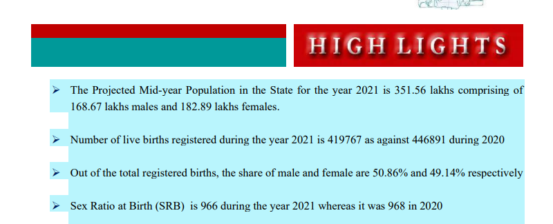 इस रिपोर्ट में सिलसिलेवार तरीके से साल 2021 में जन्में बच्चों का ब्यौरा दिया गया है. रिपोर्ट में बच्चे की माता के धर्म, शिक्षा, उम्र, क्षेत्र इत्यादि आधार पर भी आंकड़ों का वर्गीकरण किया गया है. रिपोर्ट में दिए गए आंकड़ों के अनुसार, साल 2021 में केरल में 419767 बच्चों ने जन्म लिया, जिनमें 213500 लड़के और 206250 लड़कियां थीं.